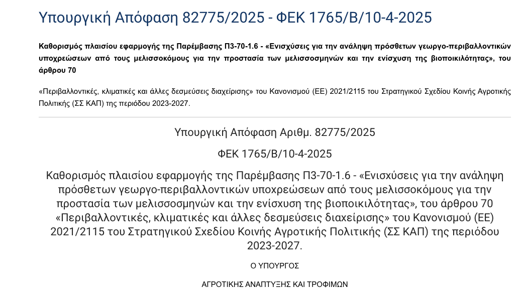 Καθορισμός πλαισίου εφαρμογής της Παρέμβασης Π3-70-1.6 – «Ενισχύσεις για την ανάληψη πρόσθετων γεωργο-περιβαλλοντικών υποχρεώσεων από τους μελισσοκόμους για την προστασία των μελισσοσμηνών και την ενίσχυση της βιοποικιλότητας», του άρθρου 70 «Περιβαλλοντικές, κλιματικές και άλλες δεσμεύσεις διαχείρισης» του Κανονισμού (ΕΕ) 2021/2115 του Στρατηγικού Σχεδίου Κοινής Αγροτικής Πολιτικής (ΣΣ ΚΑΠ) της περιόδου 2023-2027.